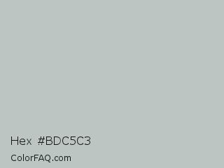 Hex #bdc5c3 Color is a light cyan color and the nearest color is Powder Ash #bcc9c2. Hex code #bdc5c3 and RGB value is rgb(189,197,195). In RGB color space, this color is composed of 74% red, 77% green, 76% blue, In CMYK color space, this color is composed of 4% cyan, 0% magenta, 1% yellow , 23% black , In HSL color space, this color has a hue angle of 165° , 6% saturation and 76% lightness.