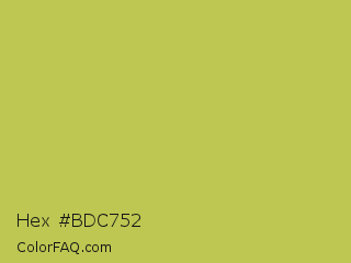 Hex #bdc752 Color is a normal yellow color and the nearest color is Celery #b8c25d. Hex code #bdc752 and RGB value is rgb(189,199,82). In RGB color space, this color is composed of 74% red, 78% green, 32% blue, In CMYK color space, this color is composed of 5% cyan, 0% magenta, 59% yellow , 22% black , In HSL color space, this color has a hue angle of 65° , 51% saturation and 55% lightness.