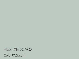 Hex #bdcac2 Color is a light green color and the nearest color is Powder Ash #bcc9c2. Hex code #bdcac2 and RGB value is rgb(189,202,194). In RGB color space, this color is composed of 74% red, 79% green, 76% blue, In CMYK color space, this color is composed of 6% cyan, 0% magenta, 4% yellow , 21% black , In HSL color space, this color has a hue angle of 143° , 11% saturation and 77% lightness.