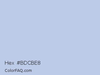 Hex #bdcbe8 Color is a very light blue color and the nearest color is Periwinkle Gray #c3cde6. Hex code #bdcbe8 and RGB value is rgb(189,203,232). In RGB color space, this color is composed of 74% red, 80% green, 91% blue, In CMYK color space, this color is composed of 19% cyan, 13% magenta, 0% yellow , 9% black , In HSL color space, this color has a hue angle of 220° , 48% saturation and 83% lightness.