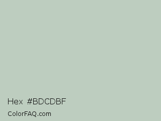 Hex #bdcdbf Color is a light green color and the nearest color is Powder Ash #bcc9c2. Hex code #bdcdbf and RGB value is rgb(189,205,191). In RGB color space, this color is composed of 74% red, 80% green, 75% blue, In CMYK color space, this color is composed of 8% cyan, 0% magenta, 7% yellow , 20% black , In HSL color space, this color has a hue angle of 128° , 14% saturation and 77% lightness.