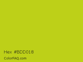 Hex #bdd018 Color is a normal yellow color and the nearest color is Key Lime Pie #bfc921. Hex code #bdd018 and RGB value is rgb(189,208,24). In RGB color space, this color is composed of 74% red, 82% green, 9% blue, In CMYK color space, this color is composed of 9% cyan, 0% magenta, 88% yellow , 18% black , In HSL color space, this color has a hue angle of 66° , 79% saturation and 45% lightness.