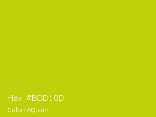Hex #bdd10d Color is a normal yellow color and the nearest color is Rio Grande #bbd009. Hex code #bdd10d and RGB value is rgb(189,209,13). In RGB color space, this color is composed of 74% red, 82% green, 5% blue, In CMYK color space, this color is composed of 10% cyan, 0% magenta, 94% yellow , 18% black , In HSL color space, this color has a hue angle of 66° , 88% saturation and 44% lightness.