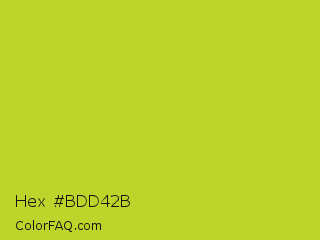 Hex #bdd42b Color is a normal yellow color and the nearest color is Key Lime Pie #bfc921. Hex code #bdd42b and RGB value is rgb(189,212,43). In RGB color space, this color is composed of 74% red, 83% green, 17% blue, In CMYK color space, this color is composed of 11% cyan, 0% magenta, 80% yellow , 17% black , In HSL color space, this color has a hue angle of 68° , 66% saturation and 50% lightness.
