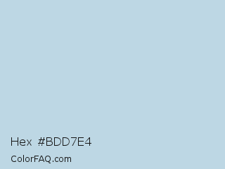Hex #bdd7e4 Color is a very light blue color and the nearest color is Pale Aqua #bcd4e6. Hex code #bdd7e4 and RGB value is rgb(189,215,228). In RGB color space, this color is composed of 74% red, 84% green, 89% blue, In CMYK color space, this color is composed of 17% cyan, 6% magenta, 0% yellow , 11% black , In HSL color space, this color has a hue angle of 200° , 42% saturation and 82% lightness.
