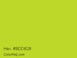 Hex #bdd828 Color is a normal yellow color and the nearest color is Key Lime Pie #bfc921. Hex code #bdd828 and RGB value is rgb(189,216,40). In RGB color space, this color is composed of 74% red, 85% green, 16% blue, In CMYK color space, this color is composed of 13% cyan, 0% magenta, 81% yellow , 15% black , In HSL color space, this color has a hue angle of 69° , 69% saturation and 50% lightness.