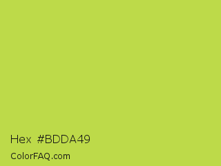 Hex #bdda49 Color is a normal lime color and the nearest color is June Bud #bdda57. Hex code #bdda49 and RGB value is rgb(189,218,73). In RGB color space, this color is composed of 74% red, 85% green, 29% blue, In CMYK color space, this color is composed of 13% cyan, 0% magenta, 67% yellow , 15% black , In HSL color space, this color has a hue angle of 72° , 66% saturation and 57% lightness.