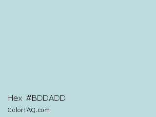 Hex #bddadd Color is a light cyan color and the nearest color is Ziggurat #bfdbe2. Hex code #bddadd and RGB value is rgb(189,218,221). In RGB color space, this color is composed of 74% red, 85% green, 87% blue, In CMYK color space, this color is composed of 14% cyan, 1% magenta, 0% yellow , 13% black , In HSL color space, this color has a hue angle of 186° , 32% saturation and 80% lightness.