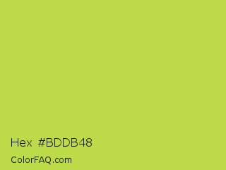 Hex #bddb48 Color is a normal lime color and the nearest color is June Bud #bdda57. Hex code #bddb48 and RGB value is rgb(189,219,72). In RGB color space, this color is composed of 74% red, 86% green, 28% blue, In CMYK color space, this color is composed of 14% cyan, 0% magenta, 67% yellow , 14% black , In HSL color space, this color has a hue angle of 72° , 67% saturation and 57% lightness.