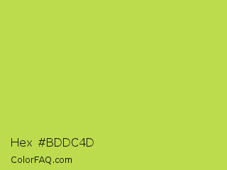 Hex #bddc4d Color is a normal lime color and the nearest color is June Bud #bdda57. Hex code #bddc4d and RGB value is rgb(189,220,77). In RGB color space, this color is composed of 74% red, 86% green, 30% blue, In CMYK color space, this color is composed of 14% cyan, 0% magenta, 65% yellow , 14% black , In HSL color space, this color has a hue angle of 73° , 67% saturation and 58% lightness.