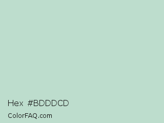 Hex #bdddcd Color is a light green color and the nearest color is Sea Mist #c5dbca. Hex code #bdddcd and RGB value is rgb(189,221,205). In RGB color space, this color is composed of 74% red, 87% green, 80% blue, In CMYK color space, this color is composed of 14% cyan, 0% magenta, 7% yellow , 13% black , In HSL color space, this color has a hue angle of 150° , 32% saturation and 80% lightness.
