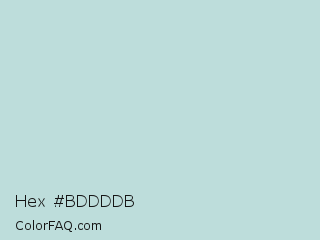 Hex #bddddb Color is a light cyan color and the nearest color is Ziggurat #bfdbe2. Hex code #bddddb and RGB value is rgb(189,221,219). In RGB color space, this color is composed of 74% red, 87% green, 86% blue, In CMYK color space, this color is composed of 14% cyan, 0% magenta, 1% yellow , 13% black , In HSL color space, this color has a hue angle of 176° , 32% saturation and 80% lightness.