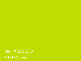 Hex #bdde00 Color is a normal yellow color and the nearest color is Fuego #bede0d. Hex code #bdde00 and RGB value is rgb(189,222,0). In RGB color space, this color is composed of 74% red, 87% green, 0% blue, In CMYK color space, this color is composed of 15% cyan, 0% magenta, 100% yellow , 13% black , In HSL color space, this color has a hue angle of 69° , 100% saturation and 44% lightness.