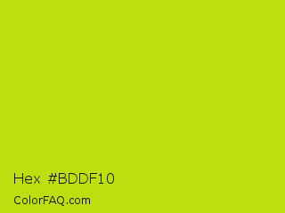 Hex #bddf10 Color is a normal yellow color and the nearest color is Fuego #bede0d. Hex code #bddf10 and RGB value is rgb(189,223,16). In RGB color space, this color is composed of 74% red, 87% green, 6% blue, In CMYK color space, this color is composed of 15% cyan, 0% magenta, 93% yellow , 13% black , In HSL color space, this color has a hue angle of 70° , 87% saturation and 47% lightness.