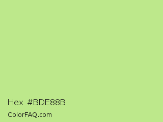 Hex #bde88b Color is a light green color and the nearest color is Medium Spring Bud #c9dc87. Hex code #bde88b and RGB value is rgb(189,232,139). In RGB color space, this color is composed of 74% red, 91% green, 55% blue, In CMYK color space, this color is composed of 19% cyan, 0% magenta, 40% yellow , 9% black , In HSL color space, this color has a hue angle of 88° , 67% saturation and 73% lightness.