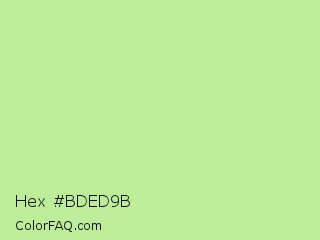 Hex #bded9b Color is a light green color and the nearest color is Reef #c9ffa2. Hex code #bded9b and RGB value is rgb(189,237,155). In RGB color space, this color is composed of 74% red, 93% green, 61% blue, In CMYK color space, this color is composed of 20% cyan, 0% magenta, 35% yellow , 7% black , In HSL color space, this color has a hue angle of 95° , 69% saturation and 77% lightness.