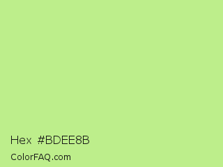 Hex #bdee8b Color is a light green color and the nearest color is Sulu #c1f07c. Hex code #bdee8b and RGB value is rgb(189,238,139). In RGB color space, this color is composed of 74% red, 93% green, 55% blue, In CMYK color space, this color is composed of 21% cyan, 0% magenta, 42% yellow , 7% black , In HSL color space, this color has a hue angle of 90° , 74% saturation and 74% lightness.