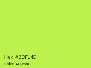 Hex #bdf14d Color is a light lime color and the nearest color is Inchworm #b2ec5d. Hex code #bdf14d and RGB value is rgb(189,241,77). In RGB color space, this color is composed of 74% red, 95% green, 30% blue, In CMYK color space, this color is composed of 22% cyan, 0% magenta, 68% yellow , 5% black , In HSL color space, this color has a hue angle of 79° , 85% saturation and 62% lightness.