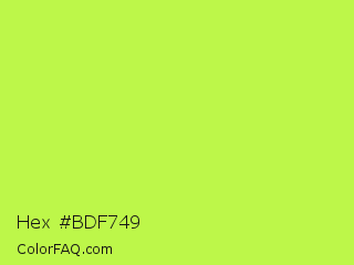 Hex #bdf749 Color is a light green color and the nearest color is Inchworm #b2ec5d. Hex code #bdf749 and RGB value is rgb(189,247,73). In RGB color space, this color is composed of 74% red, 97% green, 29% blue, In CMYK color space, this color is composed of 23% cyan, 0% magenta, 70% yellow , 3% black , In HSL color space, this color has a hue angle of 80° , 92% saturation and 63% lightness.