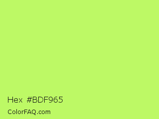 Hex #bdf965 Color is a light green color and the nearest color is Inchworm #b2ec5d. Hex code #bdf965 and RGB value is rgb(189,249,101). In RGB color space, this color is composed of 74% red, 98% green, 40% blue, In CMYK color space, this color is composed of 24% cyan, 0% magenta, 59% yellow , 2% black , In HSL color space, this color has a hue angle of 84° , 93% saturation and 69% lightness.