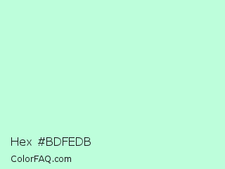 Hex #bdfedb Color is a very light green color and the nearest color is Aero Blue #c9ffe5. Hex code #bdfedb and RGB value is rgb(189,254,219). In RGB color space, this color is composed of 74% red, 100% green, 86% blue, In CMYK color space, this color is composed of 26% cyan, 0% magenta, 14% yellow , 0% black , In HSL color space, this color has a hue angle of 148° , 97% saturation and 87% lightness.