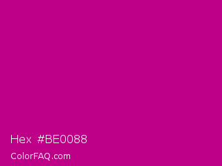 Hex #be0088 Color is a normal magenta color and the nearest color is Red Violet #c71585. Hex code #be0088 and RGB value is rgb(190,0,136). In RGB color space, this color is composed of 75% red, 0% green, 53% blue, In CMYK color space, this color is composed of 0% cyan, 100% magenta, 28% yellow , 25% black , In HSL color space, this color has a hue angle of 317° , 100% saturation and 37% lightness.