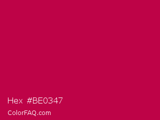 Hex #be0347 Color is a normal rose color and the nearest color is Pictorial Carmine #c30b4e. Hex code #be0347 and RGB value is rgb(190,3,71). In RGB color space, this color is composed of 75% red, 1% green, 28% blue, In CMYK color space, this color is composed of 0% cyan, 98% magenta, 63% yellow , 25% black , In HSL color space, this color has a hue angle of 338° , 97% saturation and 38% lightness.