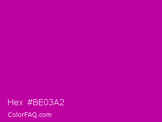 Hex #be03a2 Color is a normal magenta color and the nearest color is Heliotrope Magenta #aa00bb. Hex code #be03a2 and RGB value is rgb(190,3,162). In RGB color space, this color is composed of 75% red, 1% green, 64% blue, In CMYK color space, this color is composed of 0% cyan, 98% magenta, 15% yellow , 25% black , In HSL color space, this color has a hue angle of 309° , 97% saturation and 38% lightness.