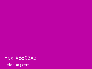 Hex #be03a5 Color is a normal magenta color and the nearest color is Heliotrope Magenta #aa00bb. Hex code #be03a5 and RGB value is rgb(190,3,165). In RGB color space, this color is composed of 75% red, 1% green, 65% blue, In CMYK color space, this color is composed of 0% cyan, 98% magenta, 13% yellow , 25% black , In HSL color space, this color has a hue angle of 308° , 97% saturation and 38% lightness.