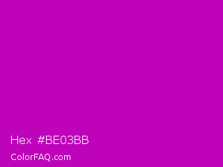 Hex #be03bb Color is a normal magenta color and the nearest color is Heliotrope Magenta #aa00bb. Hex code #be03bb and RGB value is rgb(190,3,187). In RGB color space, this color is composed of 75% red, 1% green, 73% blue, In CMYK color space, this color is composed of 0% cyan, 98% magenta, 2% yellow , 25% black , In HSL color space, this color has a hue angle of 301° , 97% saturation and 38% lightness.