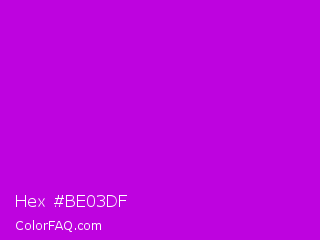 Hex #be03df Color is a normal purple color and the nearest color is Vivid Mulberry #b80ce3. Hex code #be03df and RGB value is rgb(190,3,223). In RGB color space, this color is composed of 75% red, 1% green, 87% blue, In CMYK color space, this color is composed of 15% cyan, 99% magenta, 0% yellow , 13% black , In HSL color space, this color has a hue angle of 291° , 97% saturation and 44% lightness.