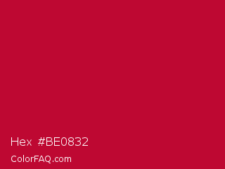 Hex #be0832 Color is a normal red color and the nearest color is Crimson Glory #be0032. Hex code #be0832 and RGB value is rgb(190,8,50). In RGB color space, this color is composed of 75% red, 3% green, 20% blue, In CMYK color space, this color is composed of 0% cyan, 96% magenta, 74% yellow , 25% black , In HSL color space, this color has a hue angle of 346° , 92% saturation and 39% lightness.