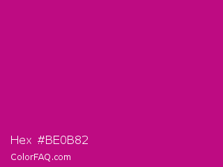 Hex #be0b82 Color is a normal magenta color and the nearest color is Red Violet #c71585. Hex code #be0b82 and RGB value is rgb(190,11,130). In RGB color space, this color is composed of 75% red, 4% green, 51% blue, In CMYK color space, this color is composed of 0% cyan, 94% magenta, 32% yellow , 25% black , In HSL color space, this color has a hue angle of 320° , 89% saturation and 39% lightness.
