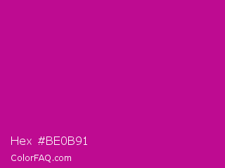 Hex #be0b91 Color is a normal magenta color and the nearest color is Red Violet #c71585. Hex code #be0b91 and RGB value is rgb(190,11,145). In RGB color space, this color is composed of 75% red, 4% green, 57% blue, In CMYK color space, this color is composed of 0% cyan, 94% magenta, 24% yellow , 25% black , In HSL color space, this color has a hue angle of 315° , 89% saturation and 39% lightness.