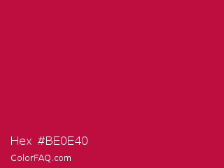 Hex #be0e40 Color is a normal rose color and the nearest color is Pictorial Carmine #c30b4e. Hex code #be0e40 and RGB value is rgb(190,14,64). In RGB color space, this color is composed of 75% red, 5% green, 25% blue, In CMYK color space, this color is composed of 0% cyan, 93% magenta, 66% yellow , 25% black , In HSL color space, this color has a hue angle of 343° , 86% saturation and 40% lightness.