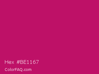 Hex #be1167 Color is a normal rose color and the nearest color is Rose Red #c21e56. Hex code #be1167 and RGB value is rgb(190,17,103). In RGB color space, this color is composed of 75% red, 7% green, 40% blue, In CMYK color space, this color is composed of 0% cyan, 91% magenta, 46% yellow , 25% black , In HSL color space, this color has a hue angle of 330° , 84% saturation and 41% lightness.