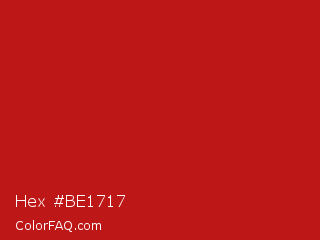 Hex #be1717 Color is a normal red color and the nearest color is International Orange Engineering #ba160c. Hex code #be1717 and RGB value is rgb(190,23,23). In RGB color space, this color is composed of 75% red, 9% green, 9% blue, In CMYK color space, this color is composed of 0% cyan, 88% magenta, 88% yellow , 25% black , In HSL color space, this color has a hue angle of 0° , 78% saturation and 42% lightness.