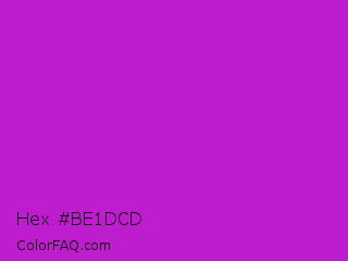 Hex #be1dcd Color is a normal magenta color and the nearest color is Steel Pink #cc33cc. Hex code #be1dcd and RGB value is rgb(190,29,205). In RGB color space, this color is composed of 75% red, 11% green, 80% blue, In CMYK color space, this color is composed of 7% cyan, 86% magenta, 0% yellow , 20% black , In HSL color space, this color has a hue angle of 295° , 75% saturation and 46% lightness.
