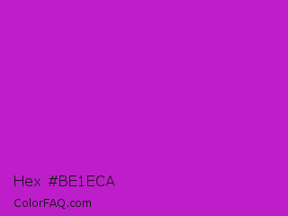 Hex #be1eca Color is a normal magenta color and the nearest color is Steel Pink #cc33cc. Hex code #be1eca and RGB value is rgb(190,30,202). In RGB color space, this color is composed of 75% red, 12% green, 79% blue, In CMYK color space, this color is composed of 6% cyan, 85% magenta, 0% yellow , 21% black , In HSL color space, this color has a hue angle of 296° , 74% saturation and 45% lightness.