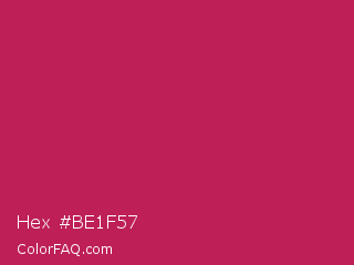 Hex #be1f57 Color is a normal rose color and the nearest color is Rose Red #c21e56. Hex code #be1f57 and RGB value is rgb(190,31,87). In RGB color space, this color is composed of 75% red, 12% green, 34% blue, In CMYK color space, this color is composed of 0% cyan, 84% magenta, 54% yellow , 25% black , In HSL color space, this color has a hue angle of 339° , 72% saturation and 43% lightness.