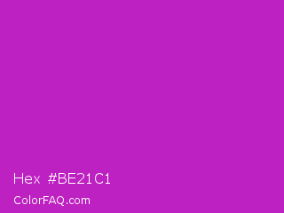 Hex #be21c1 Color is a normal magenta color and the nearest color is Steel Pink #cc33cc. Hex code #be21c1 and RGB value is rgb(190,33,193). In RGB color space, this color is composed of 75% red, 13% green, 76% blue, In CMYK color space, this color is composed of 2% cyan, 83% magenta, 0% yellow , 24% black , In HSL color space, this color has a hue angle of 299° , 71% saturation and 44% lightness.