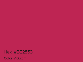 Hex #be2553 Color is a normal rose color and the nearest color is Rose Red #c21e56. Hex code #be2553 and RGB value is rgb(190,37,83). In RGB color space, this color is composed of 75% red, 15% green, 33% blue, In CMYK color space, this color is composed of 0% cyan, 81% magenta, 56% yellow , 25% black , In HSL color space, this color has a hue angle of 342° , 67% saturation and 45% lightness.