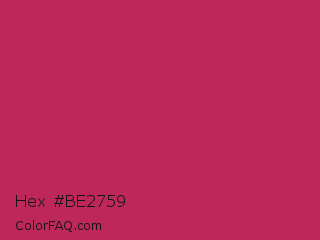 Hex #be2759 Color is a normal rose color and the nearest color is Rose Red #c21e56. Hex code #be2759 and RGB value is rgb(190,39,89). In RGB color space, this color is composed of 75% red, 15% green, 35% blue, In CMYK color space, this color is composed of 0% cyan, 79% magenta, 53% yellow , 25% black , In HSL color space, this color has a hue angle of 340° , 66% saturation and 45% lightness.