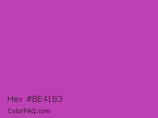 Hex #be41b3 Color is a normal magenta color and the nearest color is Byzantine #bd33a4. Hex code #be41b3 and RGB value is rgb(190,65,179). In RGB color space, this color is composed of 75% red, 25% green, 70% blue, In CMYK color space, this color is composed of 0% cyan, 66% magenta, 6% yellow , 25% black , In HSL color space, this color has a hue angle of 305° , 49% saturation and 50% lightness.