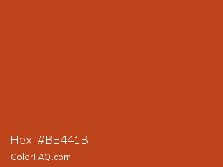 Hex #be441b Color is a normal color and the nearest color is Dark Pastel Red #c23b22. Hex code #be441b and RGB value is rgb(190,68,27). In RGB color space, this color is composed of 75% red, 27% green, 11% blue, In CMYK color space, this color is composed of 0% cyan, 64% magenta, 86% yellow , 25% black , In HSL color space, this color has a hue angle of 15° , 75% saturation and 43% lightness.