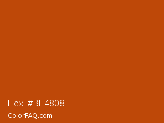 Hex #be4808 Color is a normal orange color and the nearest color is Rock Spray #ba450c. Hex code #be4808 and RGB value is rgb(190,72,8). In RGB color space, this color is composed of 75% red, 28% green, 3% blue, In CMYK color space, this color is composed of 0% cyan, 62% magenta, 96% yellow , 25% black , In HSL color space, this color has a hue angle of 21° , 92% saturation and 39% lightness.