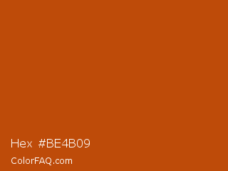 Hex #be4b09 Color is a normal orange color and the nearest color is Rock Spray #ba450c. Hex code #be4b09 and RGB value is rgb(190,75,9). In RGB color space, this color is composed of 75% red, 29% green, 4% blue, In CMYK color space, this color is composed of 0% cyan, 61% magenta, 95% yellow , 25% black , In HSL color space, this color has a hue angle of 22° , 91% saturation and 39% lightness.