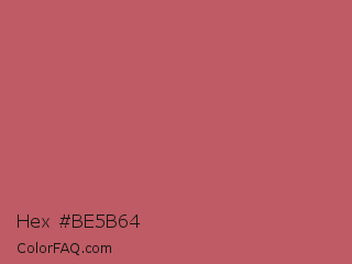 Hex #be5b64 Color is a normal red color and the nearest color is Popstar #be4f62. Hex code #be5b64 and RGB value is rgb(190,91,100). In RGB color space, this color is composed of 75% red, 36% green, 39% blue, In CMYK color space, this color is composed of 0% cyan, 52% magenta, 47% yellow , 25% black , In HSL color space, this color has a hue angle of 355° , 43% saturation and 55% lightness.