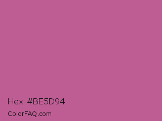 Hex #be5d94 Color is a normal magenta color and the nearest color is Pearly Purple #b768a2. Hex code #be5d94 and RGB value is rgb(190,93,148). In RGB color space, this color is composed of 75% red, 36% green, 58% blue, In CMYK color space, this color is composed of 0% cyan, 51% magenta, 22% yellow , 25% black , In HSL color space, this color has a hue angle of 326° , 43% saturation and 55% lightness.