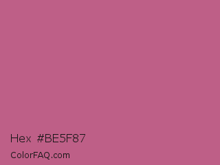 Hex #be5f87 Color is a normal rose color and the nearest color is Tapestry #b05e81. Hex code #be5f87 and RGB value is rgb(190,95,135). In RGB color space, this color is composed of 75% red, 37% green, 53% blue, In CMYK color space, this color is composed of 0% cyan, 50% magenta, 29% yellow , 25% black , In HSL color space, this color has a hue angle of 335° , 42% saturation and 56% lightness.